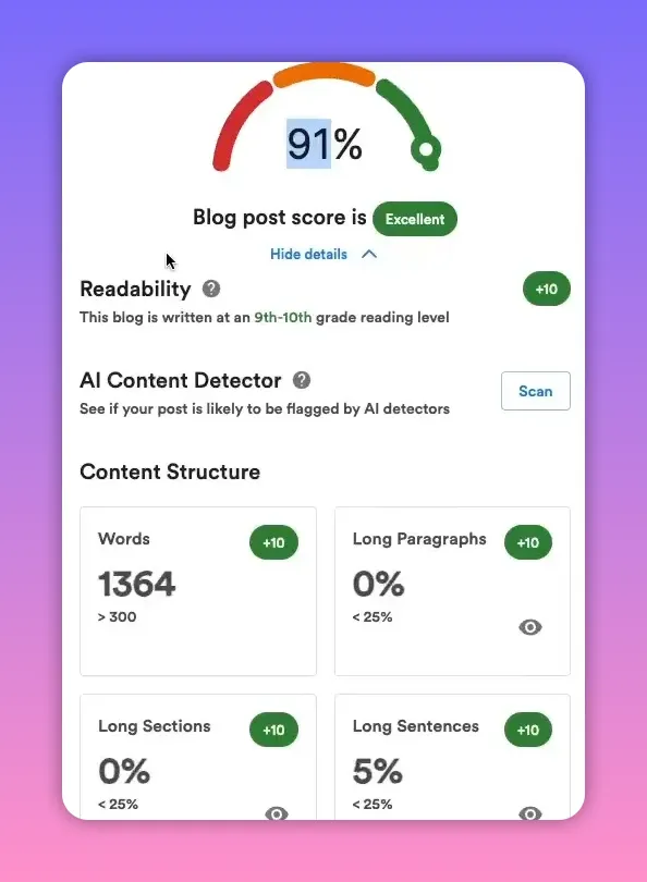 Use the platform’s built-in scorecard: readability, word count, missing alt tags, internal link coverage, and even AI content detector scans if you care about those signals. If something is missing, address it before publishing.