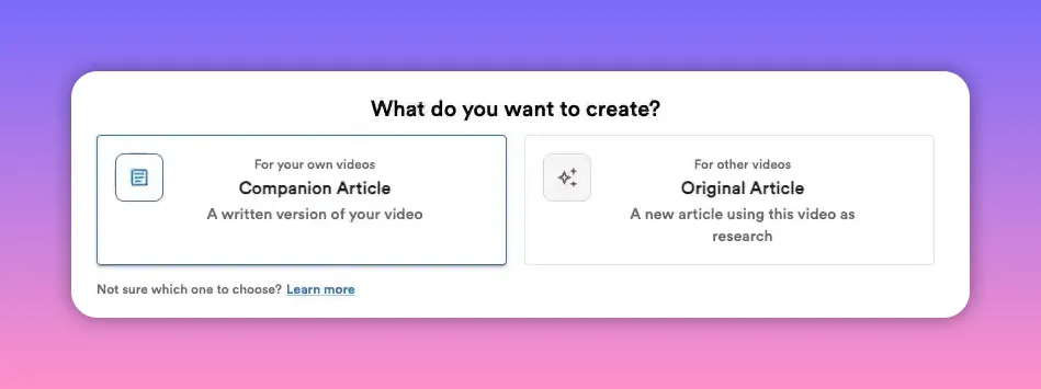 Choose Companion Article if you want a written version that aligns closely with the episode and lives alongside it on your site. Choose Original Article when you want AI to use the episode as research and produce a fresh, unique piece.