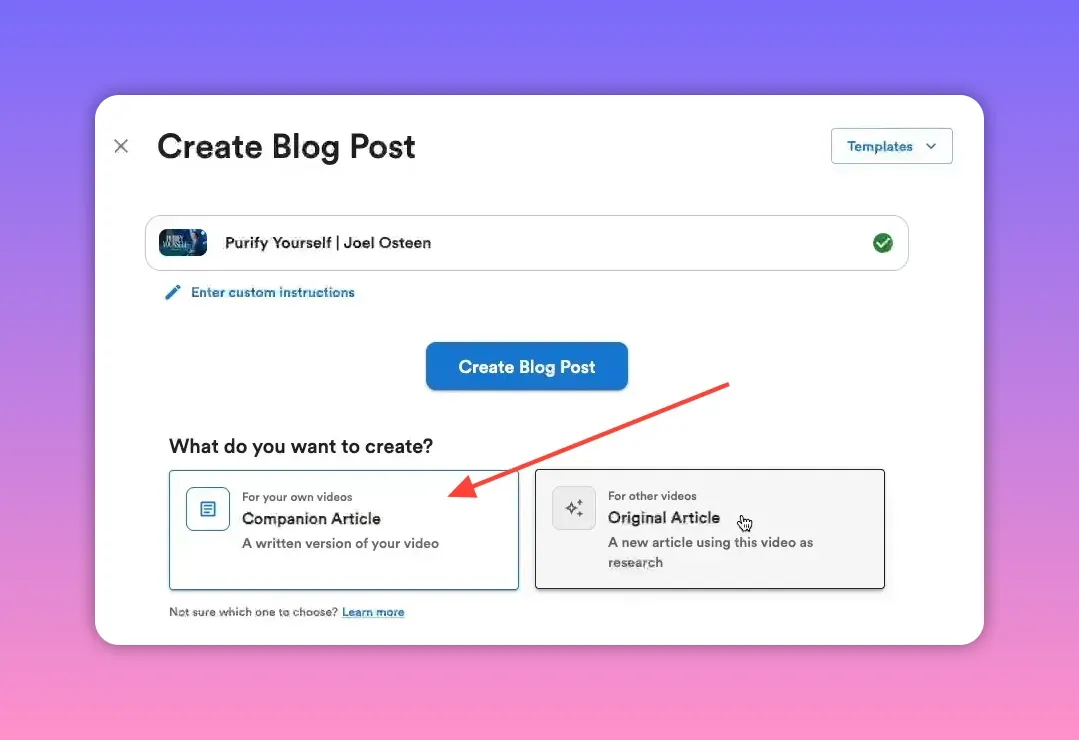 Select a content mode. For an article that accompanies your sermon video choose Companion article. If you want to use the sermon as source material for a fresh, original piece, select the research/original option.